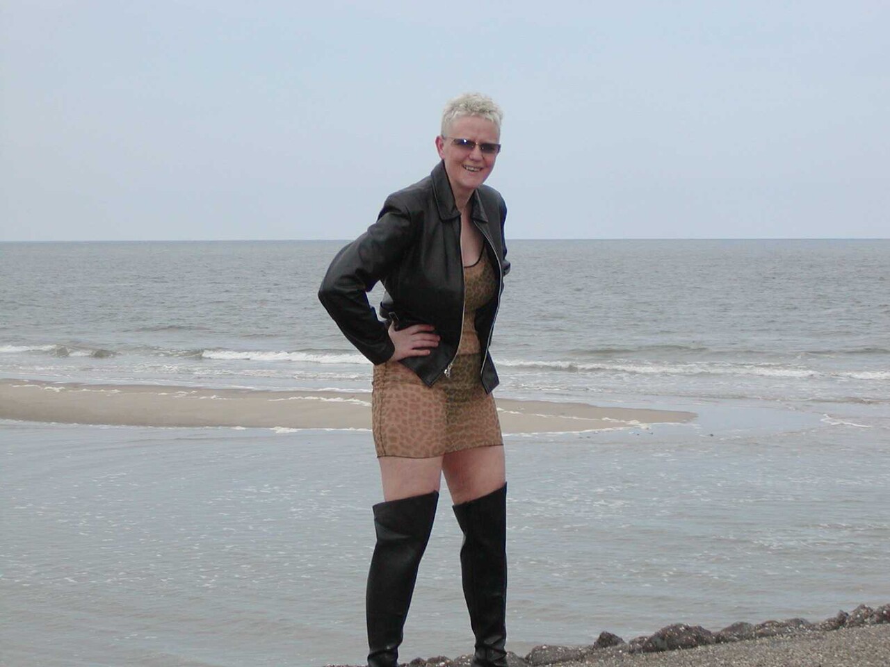 Older blonde Tiffany Pearl gets naked on a beach in black boots and shades