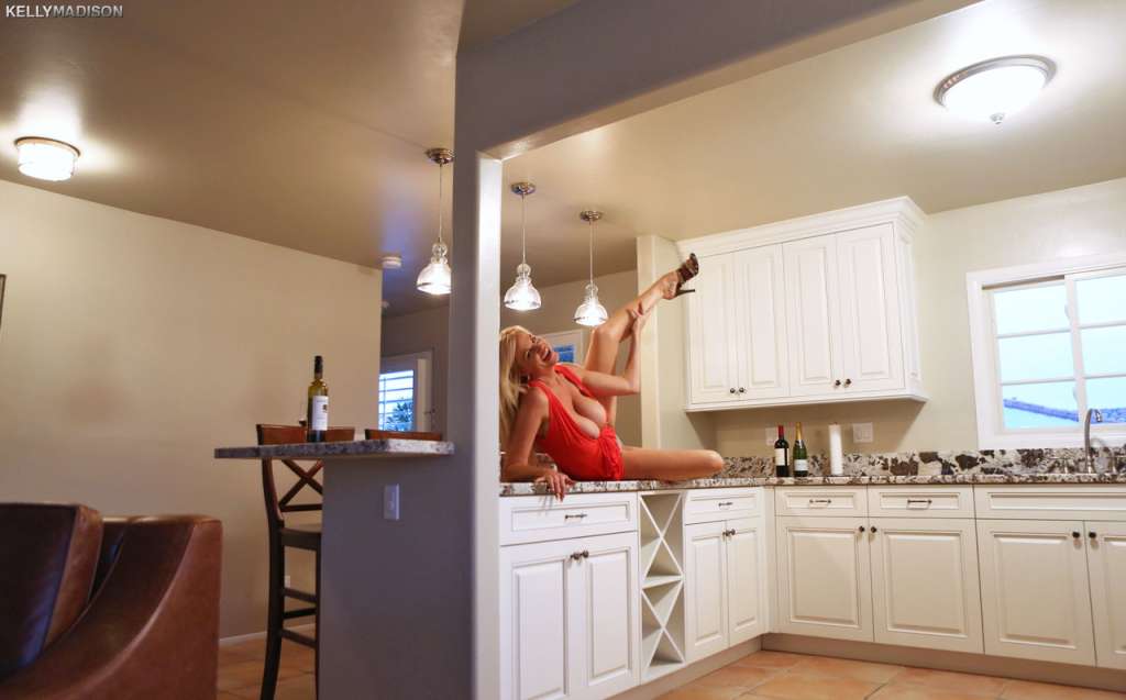 Blonde cougar with huge tits Kelly Madison flashes her twat in the kitchen